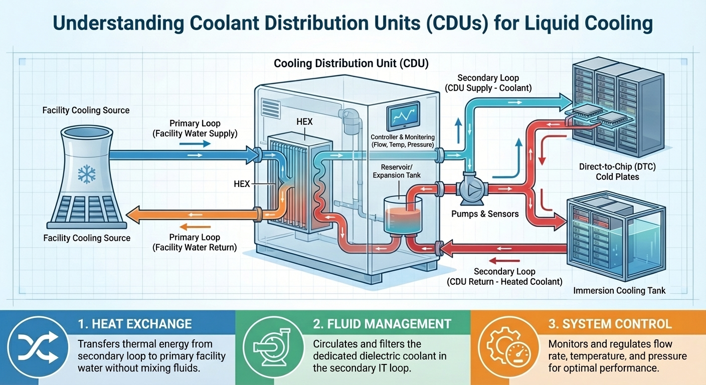A CDU makes a controlled liquid loop. This loop connects the cooling system to the servers. It keeps the two fluids from mixing directly.