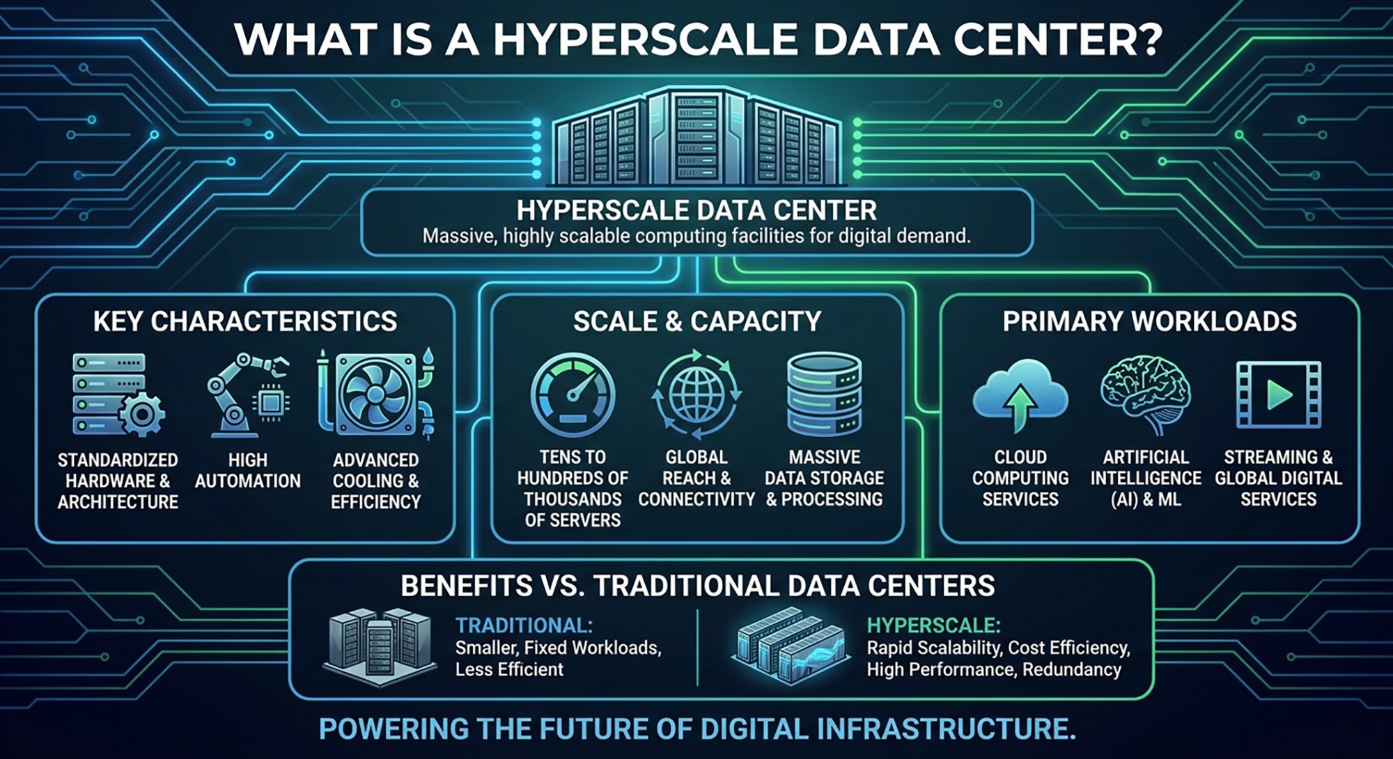 A hyperscale data center is a very large computing facility designed to scale quickly and support massive workloads. It typically contains tens or hundreds of thousands of servers and is built to handle cloud computing, AI processing, and global digital services.